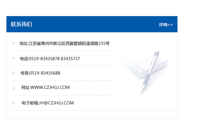 地址:常州市新北區友邦商務大廈1幢16、17層  電話:0519-85101652  傳真:0519-85112595  郵編:213022  網址:www.cz-jiayue_cn.hzlnr168.com  郵箱:xiajifengaa@163.com